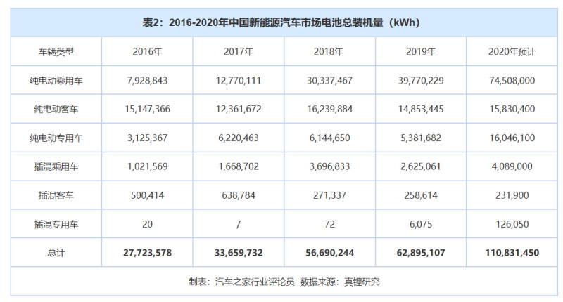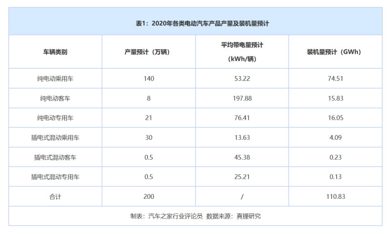 假設(shè)200萬輛目標(biāo)能夠?qū)崿F(xiàn),對各類新能源汽車產(chǎn)品2020年產(chǎn)量做了一個大概預(yù)計,見表1。至于每一類產(chǎn)品平均帶電量,僅對其中的純電動乘用車做了增長預(yù)測,按照2016-2019年的年均復(fù)合增長率13.3%預(yù)計2020年該類產(chǎn)品平均帶電量為53.22kWh/輛;其余幾類均維持2019年的水平。這樣,預(yù)計2020年中國電動汽車市場電池總裝機(jī)量可望達(dá)到110GWh,同比增長將超過75%。