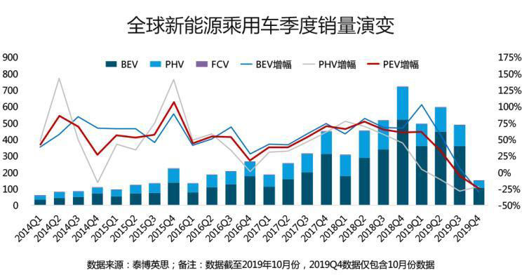 進(jìn)一步觀察全球新能源乘用車市場的季度銷量演變歷程,自2018年二季度開始,全球新能源乘用車季度銷量增幅呈現(xiàn)持續(xù)回落態(tài)勢,其中,PHEV車型回落速度顯著快于BEV車型。尤其是進(jìn)入2019年下半年之后,在中國市場的直接拉動下,2019年三季度全球新能源乘用車銷量首次出現(xiàn)下降。2019年四季度第一個月的全球新能源乘用車市場表現(xiàn)更值得堪憂,當(dāng)月總體降幅高達(dá)25%,其中純電動細(xì)分市場降幅29%,插電式混合動力市場降幅21%。