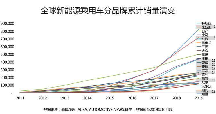 隨著全球新能源乘用車市場的快速成長,特斯拉、比亞迪和日產(chǎn)在全球新能源乘用車市場快速崛起,并居于領(lǐng)先地位;除比亞迪外,北汽、榮威、奇瑞、江淮、吉利、眾泰和知豆等中國品牌均躋身于全球新能源乘用車?yán)塾嬩N量前二十名之列;與之相對應(yīng)的是,傳統(tǒng)燃油車領(lǐng)域的強(qiáng)勢品牌,如大眾、豐田和福特等品牌的累計銷量和排名均相對靠后。