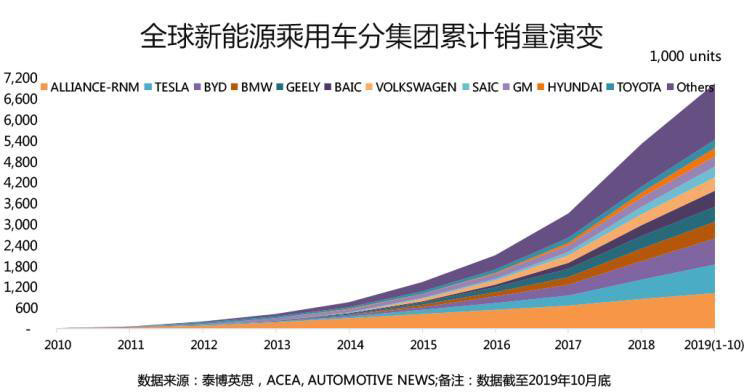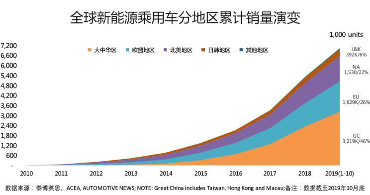 ●截至2019年10月,全球新能源乘用車?yán)塾嬩N量突破700萬輛大關(guān),大中華區(qū)以超過320萬輛的累計銷量占據(jù)全球46%的市場份額,排名第一;