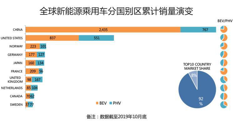 分國別來看,截至2019年10月底,中國、美國、挪威、德國、日本、法國、英國、荷蘭、加拿大和瑞典這十個國家的新能源乘用車?yán)塾嬩N量均超過10萬輛,且上述十國的新能源乘用車?yán)塾嬩N量全球占比超過92%,由此可見,全球新能源乘用車的推廣依然集中在一些頭部市場,尤其中美兩國居于顯著的領(lǐng)先地位。