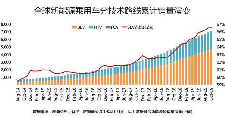 2019年,全球新能源乘用車市場雖然增速明顯放緩,但依然跨越了600萬這座高峰,并在2019年10月越過又一個重要的里程碑——累計銷量達(dá)704萬輛——突破700萬輛大關(guān);其中,純電動(BEV)車型累計實現(xiàn)銷量468萬輛,占比66.6%,插電式混動(PHEV)車型累計實現(xiàn)銷量234萬輛,占比33.2%,燃料電池(FCV)車型累計實現(xiàn)銷量1.7萬輛,占比0.2%。