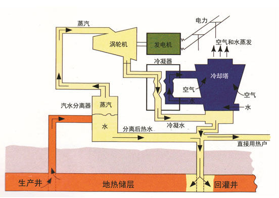地?zé)岚l(fā)電分為地?zé)岣烧羝l(fā)電、地?zé)釢裾羝l(fā)電、地?zé)犭p工質(zhì)發(fā)電、地?zé)崛靼l(fā)電、干熱巖發(fā)電。世界大功率地?zé)岚l(fā)電主要是地?zé)岣烧羝l(fā)電和地?zé)釢裾羝l(fā)電。地?zé)岣烧羝l(fā)電系統(tǒng)簡(jiǎn)單,經(jīng)濟(jì)性高。干熱巖發(fā)電利用干熱巖地?zé)豳Y源,通過(guò)熱交換產(chǎn)生熱水和蒸汽,再驅(qū)動(dòng)汽輪發(fā)電機(jī)組發(fā)電。