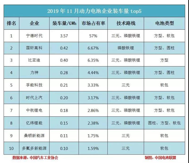 2019年11月,我國動力電池企業(yè)裝車量排名前十的分別為寧德時代、國軒高科、比亞迪、力神、孚能科技、時代上汽、中航鋰電、億緯鋰能、桑頓新能源、多氟多新能源,合計市場份額占比89.5%。