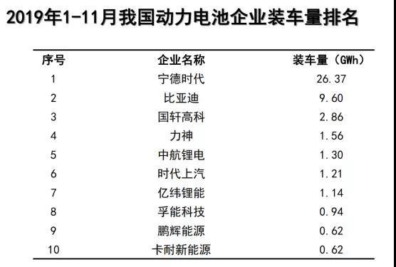 值得注意的是,2019年10月份動力電池裝車量排名第二的比亞迪,11月以0.40GWh裝車量跌落到第三,被國軒高科以0.42GWh超越。不過,比亞迪只是11月單月裝車量被超。