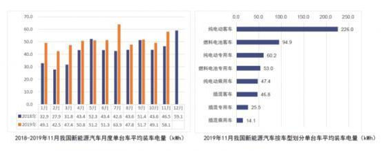 從單臺(tái)車平均裝車電量情況來看,2019年11月,受新能源客車產(chǎn)量上升影響,我國(guó)新能源汽車按車型劃分的平均裝車電量58.1kWh,環(huán)比上升18.3%。
