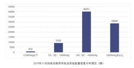 純電動(dòng)乘用車電池系統(tǒng)能量密度分布來看,2019年11月,我國(guó)純電動(dòng)乘用車系統(tǒng)能量密度在140Wh/kg及以上車型產(chǎn)量占比持續(xù)增長(zhǎng),140(含)-160Wh/kg和160Wh/kg以上車型產(chǎn)量占純電動(dòng)乘用車總產(chǎn)量比例分別提升至51.0%和36.3%,140Wh/kg以下車型產(chǎn)量占比持續(xù)降低,125Wh/kg以下車型11月產(chǎn)量總計(jì)872輛,占比下降至1.1%。