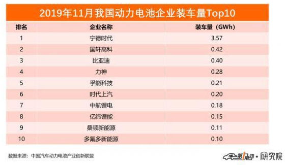 2019年1-11月,我國(guó)新能源汽車市場(chǎng)共計(jì)77家動(dòng)力電池企業(yè)實(shí)現(xiàn)裝車配套,排名前10家動(dòng)力電池企業(yè)動(dòng)力電池裝車量為46.2GWh,占總裝車量比88.0%。