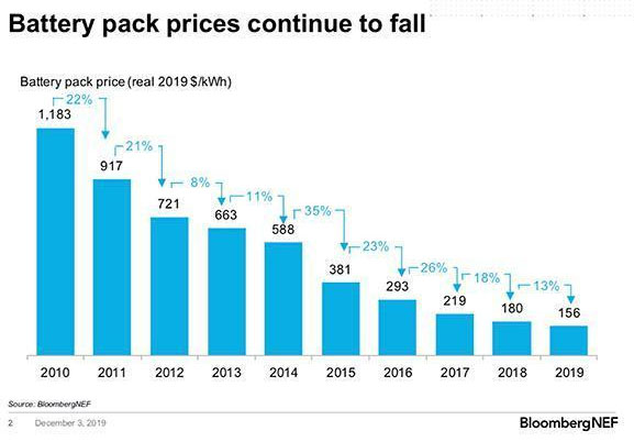 中國儲能網(wǎng)訊:12月3日,行業(yè)研究機(jī)構(gòu)彭博新能源財(cái)經(jīng)(BNEF)發(fā)布2019全球鋰離子電池組價格調(diào)研報(bào)告顯示,2019年全球鋰離子電池組的平均價格為156美元/千瓦時,較2010年的1100美元/千瓦時下降87%。其中,中國市場鋰電池組平均價格已低至147美元/千瓦時,為世界最低。