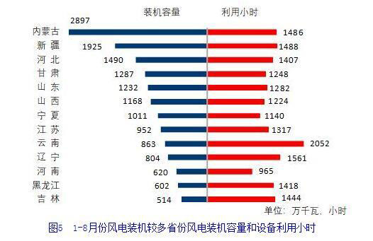 分類型看,1-8月份,全國水電設備平均利用小時為2538小時,比上年同期增加200小時。在水電裝機容量排前10的省份中,除湖北外,其他省份水電設備平均利用小時均同比增加,其中,福建、湖南、浙江和廣東同比增加超過500小時,分別增加1331、983、624和508小時;全國火電設備平均利用小時為2831小時(其中,燃煤發(fā)電和燃氣發(fā)電設備平均利用小時分別為2910和1762小時),比上年同期降低107小時。分省份看,全國共有12個省份火電設備利用小時超過全國平均水平,其中內(nèi)蒙古、河北、江西、安徽和海南超過3200小時,而云南和西藏僅為1009和189小時。與上年同期相比,共有20個省份火電利用小時同比降低,其中廣東、天津、福建、湖南、青海和浙江同比降低超過300小時,分別降低469、425、401、361、355和308小時,上海、江蘇、云南、河南、江西和遼寧降低超過200小時,而廣西和四川分別增加385和355小時,新疆和湖北增加超過200小時;全國核電設備平均利用小時4844小時,比上年同期降低96小時;全國并網(wǎng)風電設備平均利用小時1388小時,比上年同期降低24小時;全國太陽能發(fā)電設備平均利用小時895小時,比上年同期增加43小時。