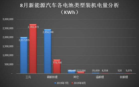 從8月各類型電池裝機量來看,受新能源乘用車裝機量大幅增長和新能源客車裝機電量大幅下滑影響,三元電池和磷酸鐵鋰電池的裝機情況也和7月相比出現(xiàn)了逆轉(zhuǎn)。
