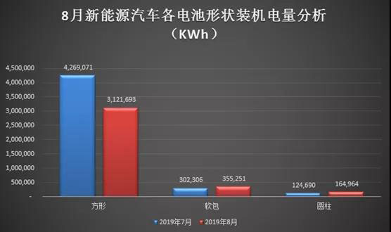 從8月各形狀電池裝機量來看,方形電池出現(xiàn)明顯環(huán)比下滑,軟包、圓柱環(huán)比裝機量呈現(xiàn)小幅回升態(tài)勢。