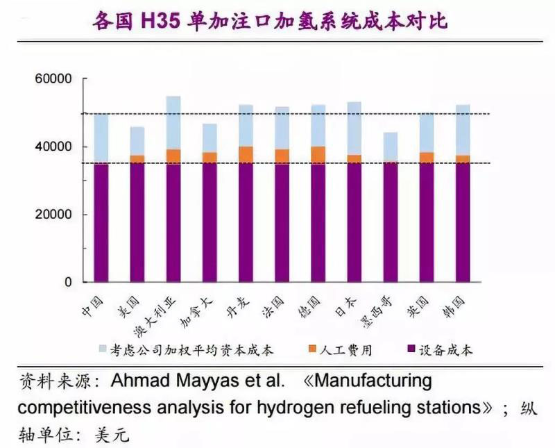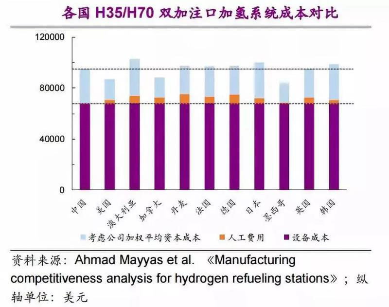 (3)我國加氫站儲氫系統(tǒng)建設(shè)成本優(yōu)勢來源依然是我國較低的人工費用。