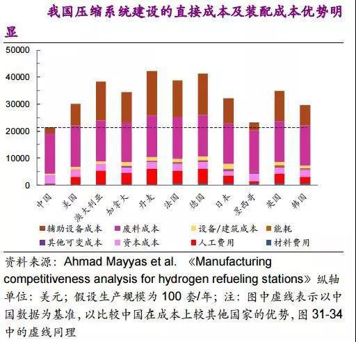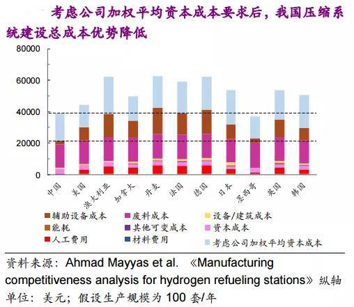 (1)我國壓縮系統(tǒng)建設(shè)的直接成本和裝配成本在國際上具有明顯優(yōu)勢,明顯低于美國、日本、德國等氫能利用更為廣泛的國家;