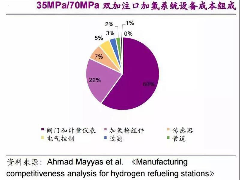 (1)設(shè)備成本中最主要的為閥門和計量儀表等,占設(shè)備成本的60%左右,用于監(jiān)測壓力以及氫泄露相關(guān)的傳感器也是加氫系統(tǒng)成本的重要組成部分;