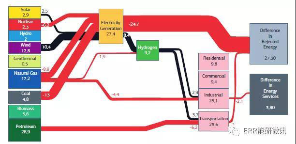 與"一切照舊"情景相比,2040年美國(guó)能流圖中在氫技術(shù)集成方面的變化