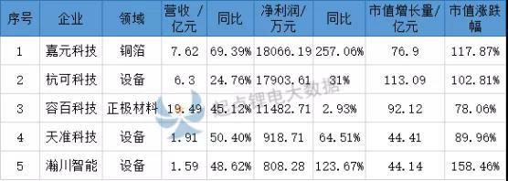 近期,5家鋰電產(chǎn)業(yè)鏈企業(yè)上半年業(yè)績均已出爐,其中容百科技營收19.49億元,排名第1位,與去年同期相比增長了45.12%;凈利潤最高的為嘉元科技,為1.81億元,同比增長了257.06%,同時,嘉元科技也是5家企業(yè)中凈利增長最快的企業(yè);從市值來看,杭可科技市值增長量最高,由發(fā)行時的109.99億元增長至現(xiàn)在的223.08億元,增幅達到102.81%。