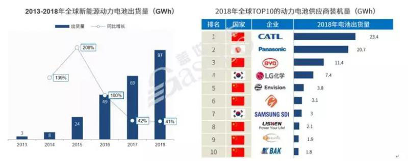 根據(jù)蓋世汽車研究院統(tǒng)計(jì),2018年全球新能源動(dòng)力電池出貨量達(dá)到97GWh,同比增長(zhǎng)41%。而裝機(jī)量占據(jù)前十名的企業(yè)均被中日韓三國(guó)包攬,除來(lái)自日本的松下、來(lái)自韓國(guó)的LG化學(xué)、三星SDI以外,其余七家均為中國(guó)企業(yè),代表企業(yè)有寧德時(shí)代(CATL)、比亞迪和國(guó)軒高科。