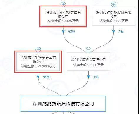鴻鵬新能源成立于2018年11月,由寶能投資集團與寶源物流共同出資建立。其中,寶能集團出資29.7億元,占股99%;寶源物流出資3000萬元,占股1%。值得一提的是,寶源物流背后實際控制人同樣為寶能集團(占股95%)。
