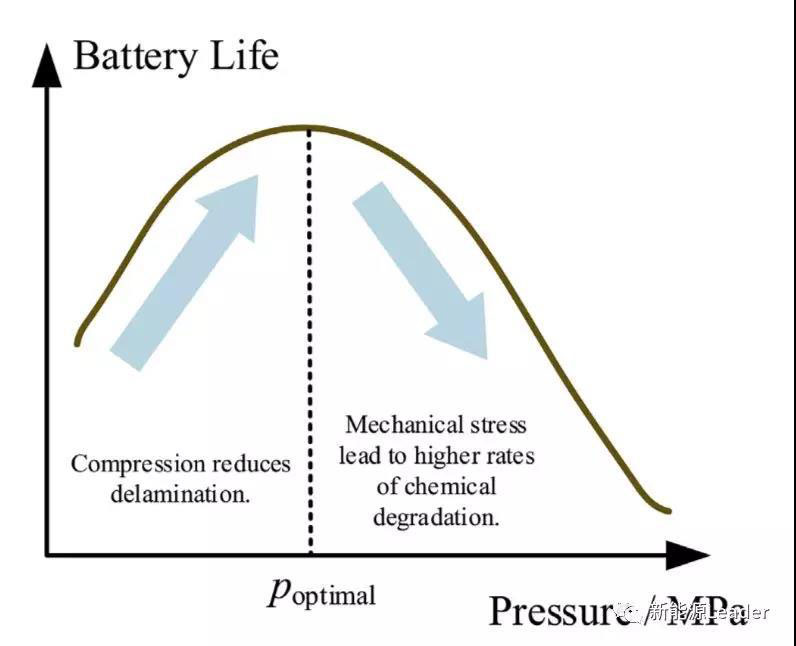 在單體電池組合時(shí)為了穩(wěn)定電池組的結(jié)構(gòu),通常需要施加一定的壓力,而壓力大小對(duì)于鋰離子電池的循環(huán)壽命有著一定的影響,研究表明施加一定程度的壓力有利于提升電極之間的接觸,從而改善電池的使用壽命,但是當(dāng)壓力過高時(shí)由于電池內(nèi)阻增加,引起負(fù)極極化的增加,從而導(dǎo)致負(fù)極析鋰等問題,使得鋰離子電池壽命在較大壓力下急劇衰降,因此選擇合適的壓力對(duì)于鋰離子電池的壽命提升同樣重要。