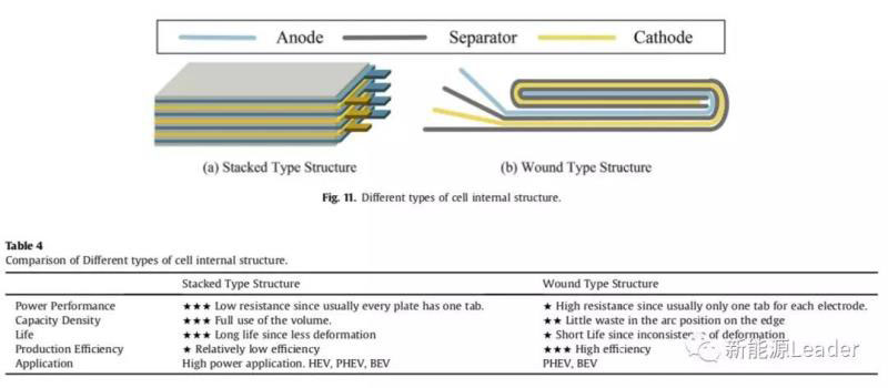 電芯結(jié)構(gòu)大體上可以分為兩類:1)疊片式結(jié)構(gòu);2)卷繞式結(jié)構(gòu)(如下圖所示),卷繞式結(jié)構(gòu)生產(chǎn)效率高,但是在邊緣彎曲處會(huì)形成較大的應(yīng)力和變形,這會(huì)導(dǎo)致電極內(nèi)部Li濃度的分布不均,影響鋰離子電池使用壽命和安全性。疊片式結(jié)構(gòu)生產(chǎn)效率較低,但是極片受力更加均勻,因此一致性更好。
