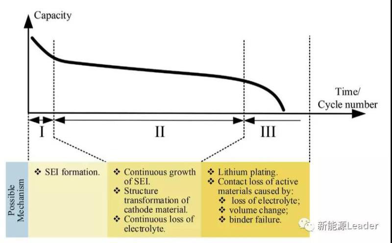 對(duì)于多數(shù)動(dòng)力電池而言,其壽命衰降都不是線性的(如下圖所示),通常我們可以將其在整個(gè)生命周期內(nèi)的衰降分為三個(gè)階段:1)第一階段,這一階段主要是因?yàn)槌跗谛纬傻腟EI膜還不穩(wěn)定,因此電解液還會(huì)持續(xù)的負(fù)極表面發(fā)生分解,因此活性Li的消耗和SEI膜的生長(zhǎng)是這一階段容量衰降的主要因素;2)第二階段,在這一階段SEI膜厚度顯著增加,因此電解液在負(fù)極表面的分解速度大大降低,因而電池容量的衰降速度也明顯降低,而其他的一些副反應(yīng),例如正極材料的相變等因素在鋰離子電池容量衰降中所占的比例有所上升;3)第三階段,這一階段鋰離子電池的容量快速衰降,這主要是因?yàn)閴勖┢谪?fù)極內(nèi)部的孔隙被大量的SEI膜所填充,引起金屬Li在負(fù)極表面的析出,加速了電池活性Li的損失。