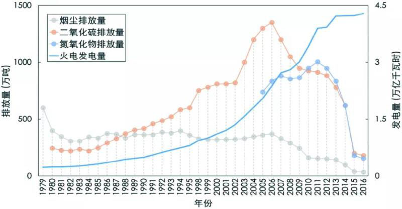 圖4 我國1979~2016年火電大氣污染物排放趨勢(shì)圖