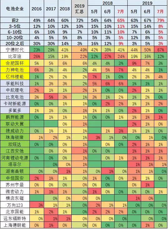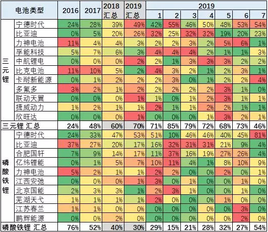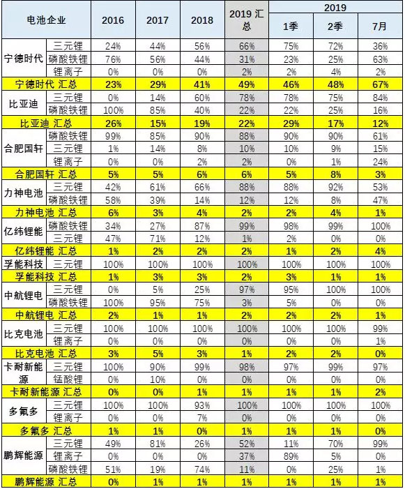 寧德時(shí)代上市前后很強(qiáng),1-7月也很優(yōu)秀,達(dá)到49%。而比亞迪的電池需求也比2018年大幅增長(zhǎng),份額達(dá)到22%,這也是客車的體系支撐對(duì)比亞迪在7月稍低。