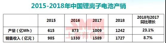 根據(jù)中國化學(xué)與物理電源行業(yè)協(xié)會統(tǒng)計(jì)分析,2018年中國鋰離子電池銷售收入達(dá)到1727億元,比2017年的1589億元,同比增長8.7%。鋰離子電池的產(chǎn)量由1009億瓦時(shí)增長到1242億瓦時(shí),同比增長23.1%。主要是由新能源汽車動(dòng)力電池和儲能電池市場的快速增長。