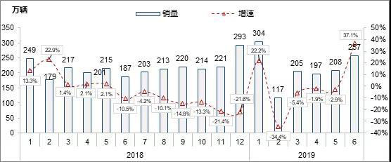 2018-2019年上半年中國汽車市場終端零售月度走勢