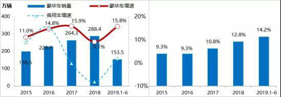 豪華車市場2019年上半年銷量及份額走勢圖