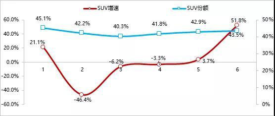 2019年上半年SUV市場月度份額及增速走勢