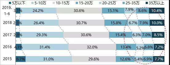 分價格區(qū)間看,消費升級背景下價格上移趨勢明顯,20萬以上市場發(fā)展向好。2019年上半年,僅5-10萬區(qū)間呈現(xiàn)下滑,其余價格區(qū)間均呈現(xiàn)不同程度增長,其中20-25萬區(qū)間同比增長26.2%,增幅最大,25-35萬以及35萬以上區(qū)間增幅也優(yōu)于整體市場。從市場份額來看,20萬以上區(qū)間市場份額均呈現(xiàn)逐年提升態(tài)勢,整體市場價格向上偏移,消費升級趨勢明顯。