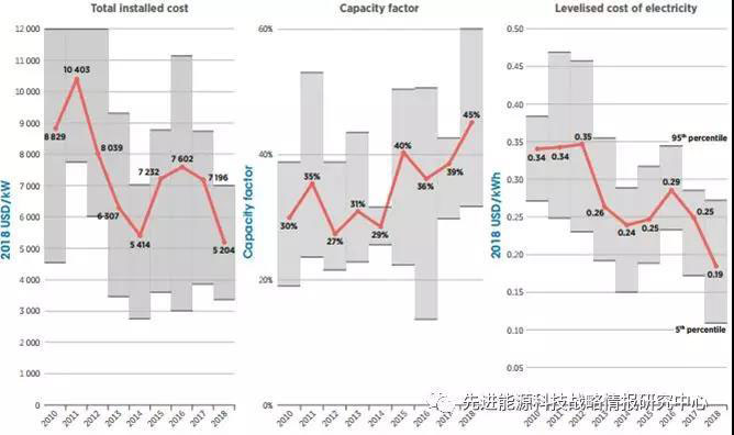 圖3b 2010-2018年間海上風電全球加權平均裝機成本(單位:美元/千瓦)、容量因子和LCOE(單位:美元/千瓦時)變化態(tài)勢