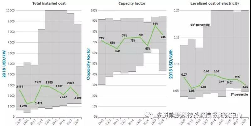 圖6 2010-2018年間地熱發(fā)電全球加權平均裝機成本(單位:美元/千瓦)、容量因子和LCOE(單位:美元/千瓦時)變化態(tài)勢