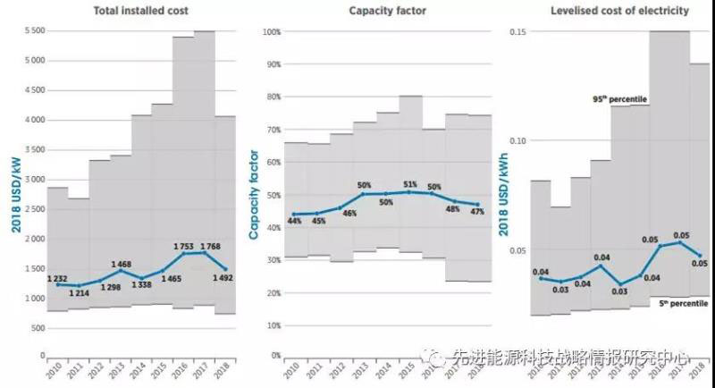圖2 2010-2018年間CSP全球加權平均裝機成本(單位:美元/千瓦)、容量因子和LCOE(單位:美元/千瓦時)變化態(tài)勢