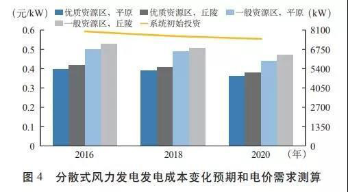 從發(fā)展趨勢來看,受光伏發(fā)電主要部件價格快速下降的影響,預計未來光伏發(fā)電初始投資將大幅下降;人力資源和屋頂資源成本的提升影響將使運行成本保持穩(wěn)定或小幅提升。通過技術(shù)創(chuàng)新和智能化應用帶來的風電整體效率的提升,將為分散式風力發(fā)電的成本提供一定下降空間,然而由于人力資源成本和原材料價格等持續(xù)呈現(xiàn)上漲趨勢,分散式風力發(fā)電成本相對穩(wěn)定,下降空間有限。在內(nèi)部收益率(IRR)為8%時,分散式風力發(fā)電和分布式光伏發(fā)電電價需求測算如圖4所示。