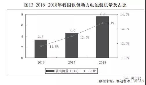 隨著新能源汽車(chē)安全性能愈發(fā)受到重視,軟包電池在動(dòng)力電池市 場(chǎng)滲透率穩(wěn)步提升。根據(jù)GBII的統(tǒng)計(jì),2018年我國(guó)軟包動(dòng)力電池裝機(jī)量約為7.6GWh,同比增長(zhǎng)65.2%, 增速較2017年提高25.8個(gè)百分點(diǎn);軟包電池約占當(dāng)年我國(guó)動(dòng)力裝機(jī)量的13.4%,而在2017年、2016年這一數(shù)據(jù)還分別為12.5%和11.8%,2018年軟包動(dòng)力電池占比增幅為 0.9個(gè)百分點(diǎn),增幅較2017年提高 0.2個(gè)百分點(diǎn)。