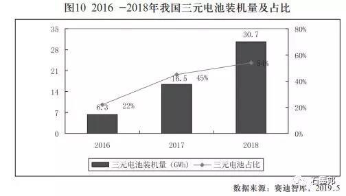 2017年以來(lái),我國(guó)新能源汽車(chē)補(bǔ)貼加大了對(duì)高能量密度動(dòng)力電池的支持力度。三元電池憑借高能量密度優(yōu)勢(shì)快速崛起,強(qiáng)勢(shì)改變動(dòng) 力電池市場(chǎng)格局。2017年三元電池裝機(jī)量達(dá)到了16.5GWh,增幅近10GWh,占動(dòng)力電池裝機(jī)量的比重達(dá)45%,較2016年的22%提高了23個(gè)百分點(diǎn)。2018年,我國(guó)動(dòng)力電池裝機(jī)量達(dá)到了57GWh,其中三元電池裝機(jī)量30.7GWh,同比增長(zhǎng)91.7%,占動(dòng)力電池裝機(jī)量的比重達(dá)54%,較2017年提高了9個(gè)百分點(diǎn)。隨著三元電池能量密度和安全性不斷提 升,其在動(dòng)力電池市場(chǎng)占比將穩(wěn)步提升。