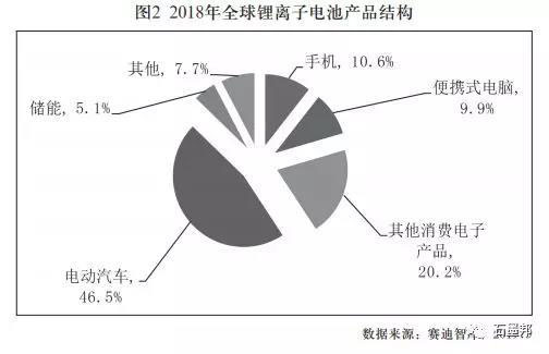 按容量計(jì)算,2018年消費(fèi)類(lèi)鋰離子電池(含手機(jī)、便攜式電腦和其他消費(fèi)電子產(chǎn)品)占比40.7%, 比 2 0 1 7年下降了7.3個(gè)百分點(diǎn);電動(dòng)汽車(chē)用鋰離子電池占比達(dá)到46.5%,首次超過(guò)消費(fèi)類(lèi)鋰離子電池,而2017年電動(dòng)汽車(chē)用鋰離子電池占比還只有40%;儲(chǔ)能用鋰離子電池占比達(dá)到了5.1%,較2017年增長(zhǎng)了0.7個(gè)百分點(diǎn);其他用途(含電動(dòng)工具、電動(dòng)自行車(chē)等)鋰離子電池占比為7.7%,基本與2017年持平。電動(dòng)汽車(chē)用鋰離子電池已經(jīng)成 為拉動(dòng)全球鋰離子電池產(chǎn)業(yè)增長(zhǎng)的主要?jiǎng)恿Γ?018年其對(duì)全球鋰離子電池產(chǎn)業(yè)增長(zhǎng)的貢獻(xiàn)率72.5%。