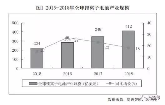 在全球電動(dòng)汽車(chē)市場(chǎng)快速增長(zhǎng)帶動(dòng)下,全球鋰離子電池繼續(xù)保 持快速增長(zhǎng)勢(shì)頭。2018年全球鋰離子電池產(chǎn)業(yè)規(guī)模首次突破400億美元,達(dá)到412億美元,同比增長(zhǎng)18%,增速較2017年小幅下滑了5個(gè)百分點(diǎn)。
