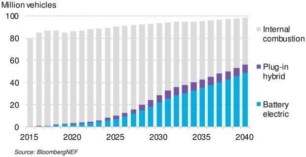 ▲彭博新能源財經(jīng)(BloombergNEF)的研究顯示,到2040年,大約57%的汽車將由電池驅(qū)動