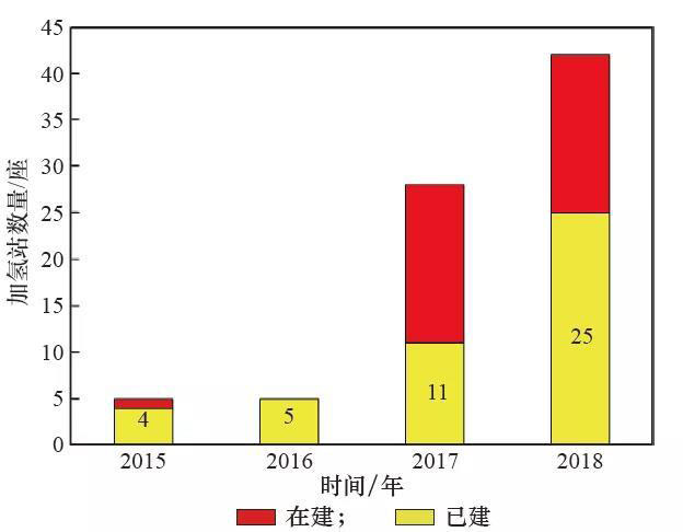 為了滿足車輛應(yīng)用示范,各地已開始大規(guī)模規(guī)劃并建設(shè)保障性加氫站,截至2019年3月,中國已投產(chǎn)加氫站數(shù)量達(dá)到25座(包括兩座內(nèi)部整改站),較2017年增加14座。