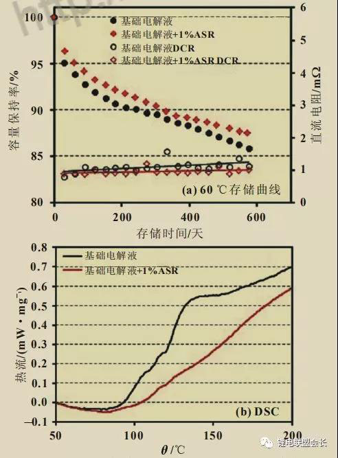 因為電池高溫存儲過程中的容量損失主要來自陽極表面的副反應(yīng)造成的活性鋰離子損失,所以在電解液中添加SEI膜熱穩(wěn)定添加劑(ASR)可以提升SEI膜的高溫穩(wěn)定性,降低陽極表面的副反應(yīng)活性,減少活性鋰離子損耗。