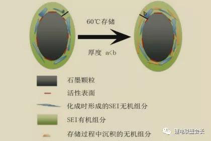 綜上所述,在高溫存儲過程中,嵌鋰態(tài)陽極長期處于低電位狀態(tài),電解液還原反應(yīng)消耗活性鋰離子,最終生成無機鋰鹽;高溫增加了電解液還原反應(yīng)速率,使活性鋰離子大量損失(圖6)。此外,陽極副反應(yīng)產(chǎn)物沉積、SEI膜增厚,造成電極動力學(xué)性能變差。