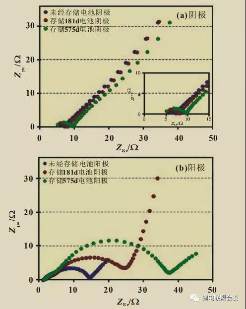 電化學(xué)阻抗譜(EIS)(見圖5)中,雖然陰極Rct隨高溫存儲時間延長而增大[圖5(a)],但陰極Rct較小,對電池內(nèi)阻影響也較小。陽極EIS[圖5(b)]RSEI隨存儲時間變化不明顯,但Rct隨存儲時間延長而顯著增加。由于高溫存儲過程中電解液副反應(yīng)產(chǎn)物沉積于石墨表面,陽極比表面積隨存儲時間增加而減小,存儲0、181和575d電池陽極比表面積分別為3.42、2.97和1.84cm2/g。陽極比表面積下降使發(fā)生在陽極表面的電化學(xué)反應(yīng)活性減小,導(dǎo)致陽極/電解液表面的電荷轉(zhuǎn)移電阻Rct增大。