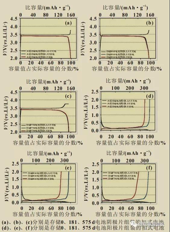 將不同存儲時間的電池在100%SOC拆解,以其中的極片作為工作電極、鋰片作為對電極制作扣式電池,以0.1C倍率進行充放電測試(圖3)。