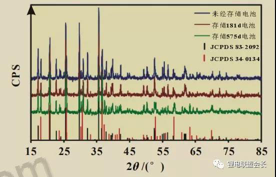 圖 2 不同存儲時間的電池陰極的XRD譜圖