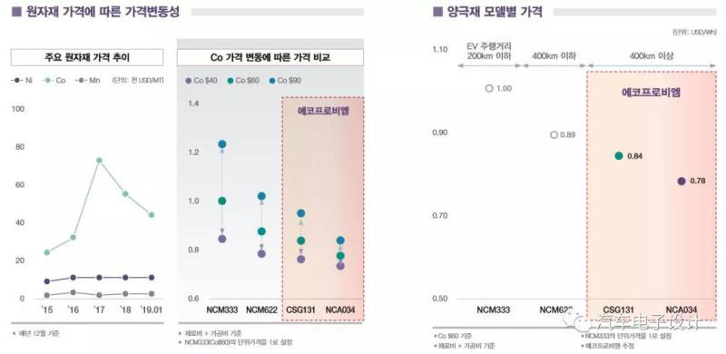 所以呢,在評(píng)估到底用NCA還是NCM811的時(shí)候,如下圖左半邊有個(gè)材料價(jià)格和鈷價(jià)格的相關(guān)性。在這里評(píng)估,采用Ecopro的產(chǎn)品,做NCM811可以做到84美金/kWh,用NCA可以做到78美金/kWh