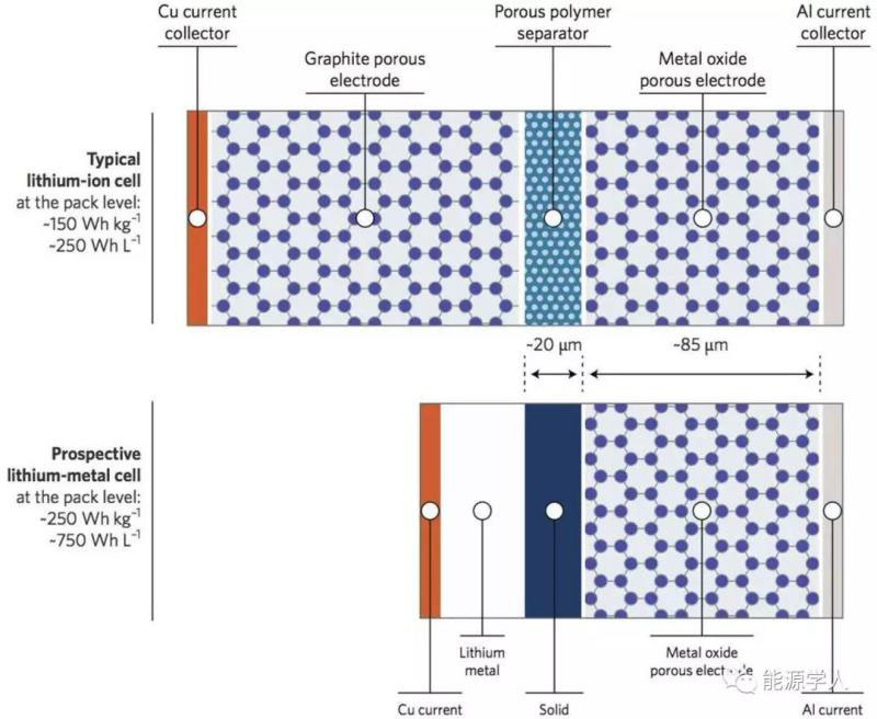 圖9 鋰離子電池(上)和鋰金屬電池(下)示意圖,鋰金屬電池包括1層隔膜和1層致密的金屬鋰。鋰金屬電池處于充電狀態(tài),鋰含量超過20%。層厚按比例顯示。鋰金屬代替石墨電極后,電池體積和質(zhì)量的減少是很明顯的。鋰金屬電極的另一個概念包括使用宿主結(jié)構(gòu),該宿主結(jié)構(gòu)限制了鋰金屬電極的體積變化。